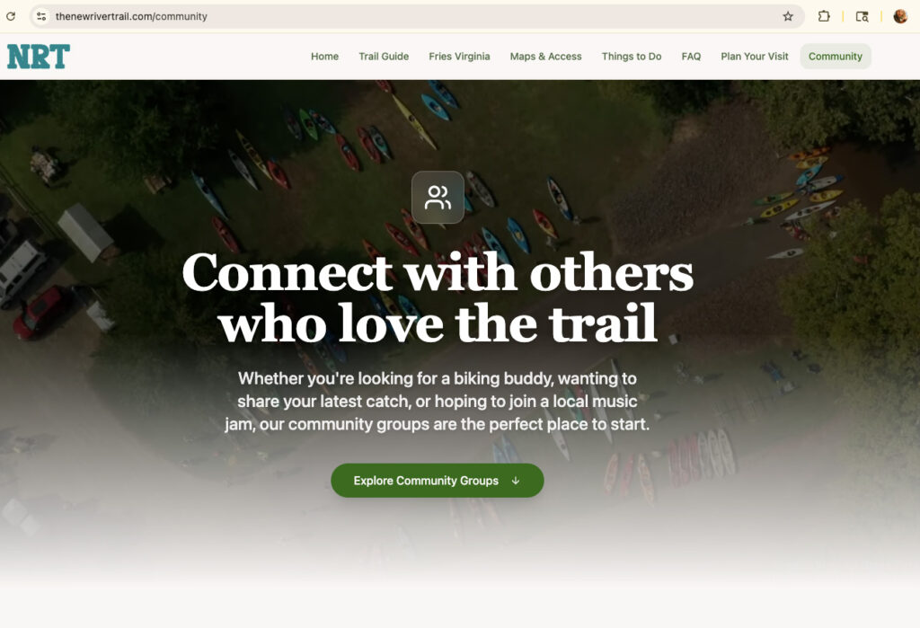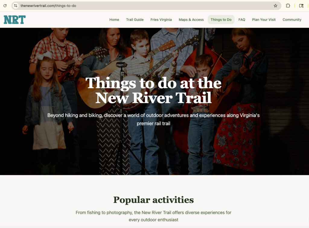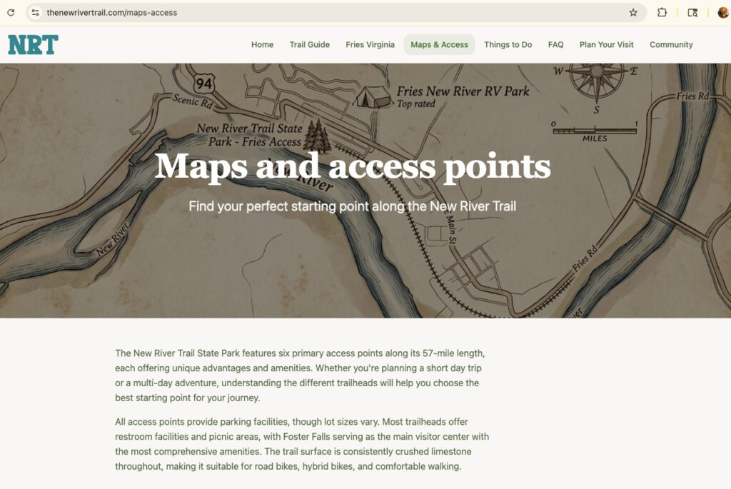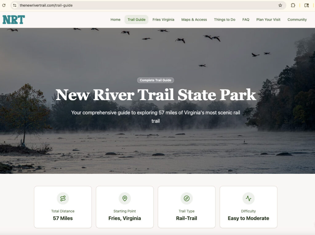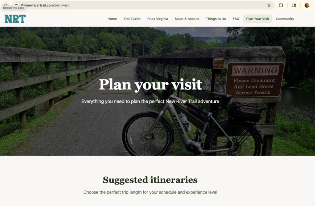 We are an independent website created by the Town of Fries to improve tourism and provide a resource for visitors to our area who are interested in making a day trip or coming for an overnight stay. The New River Trail offers so much to anyone who enjoys biking, hiking, camping, tubing, kayaking, canoeing, nature photography and all things outdoors!