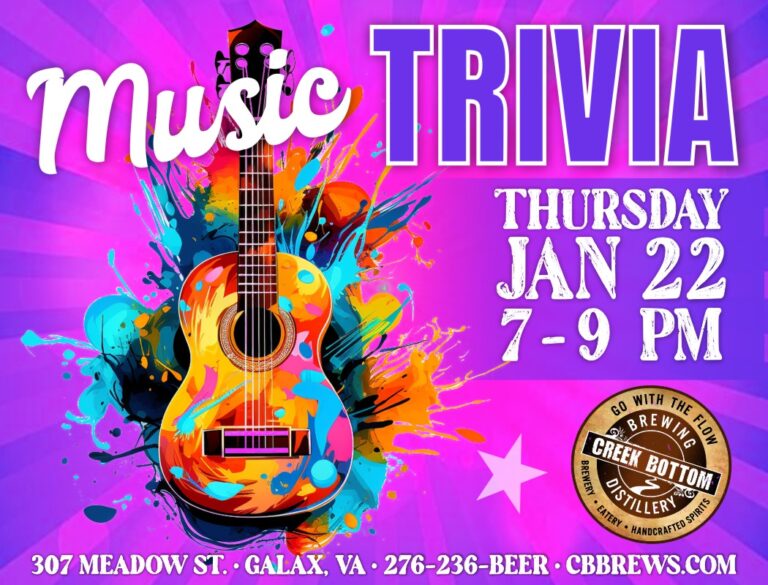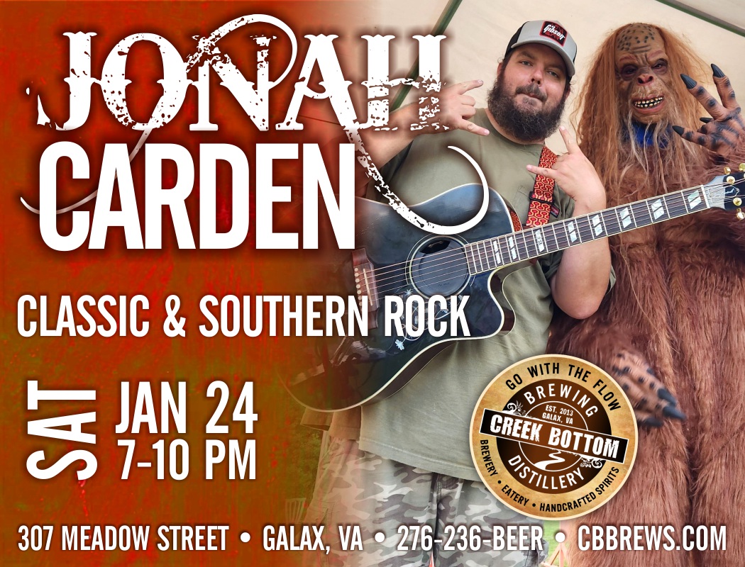 Home Calendar Food & Drink Jonah Carden Onstage at Creek Bottom! Jonah Carden Onstage at Creek Bottom! Creek Bottom Brewing, Distillery & Restaurant Date: Sat, January 24th 2026 Time: 07:00 pm - 10:00 pm Address: 307 Meadow Street, Galax VA 24333 About Jonah Carden live at Creek Bottom Brewing on Sat, Jan 24 from 7-10. Dine to the tunes of some bluesy classic and southern rock. Life ain’t so bad down at The Bottom!