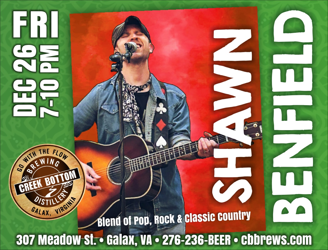 Shawn Benfield will be rocking Creek Bottom Brewing the day after Christmas with a fantastic live show on Fri, Dec 26 from 7-10 pm! Come out and blow the suds off a cold one to a mix of pop, rock and classic country tunes.