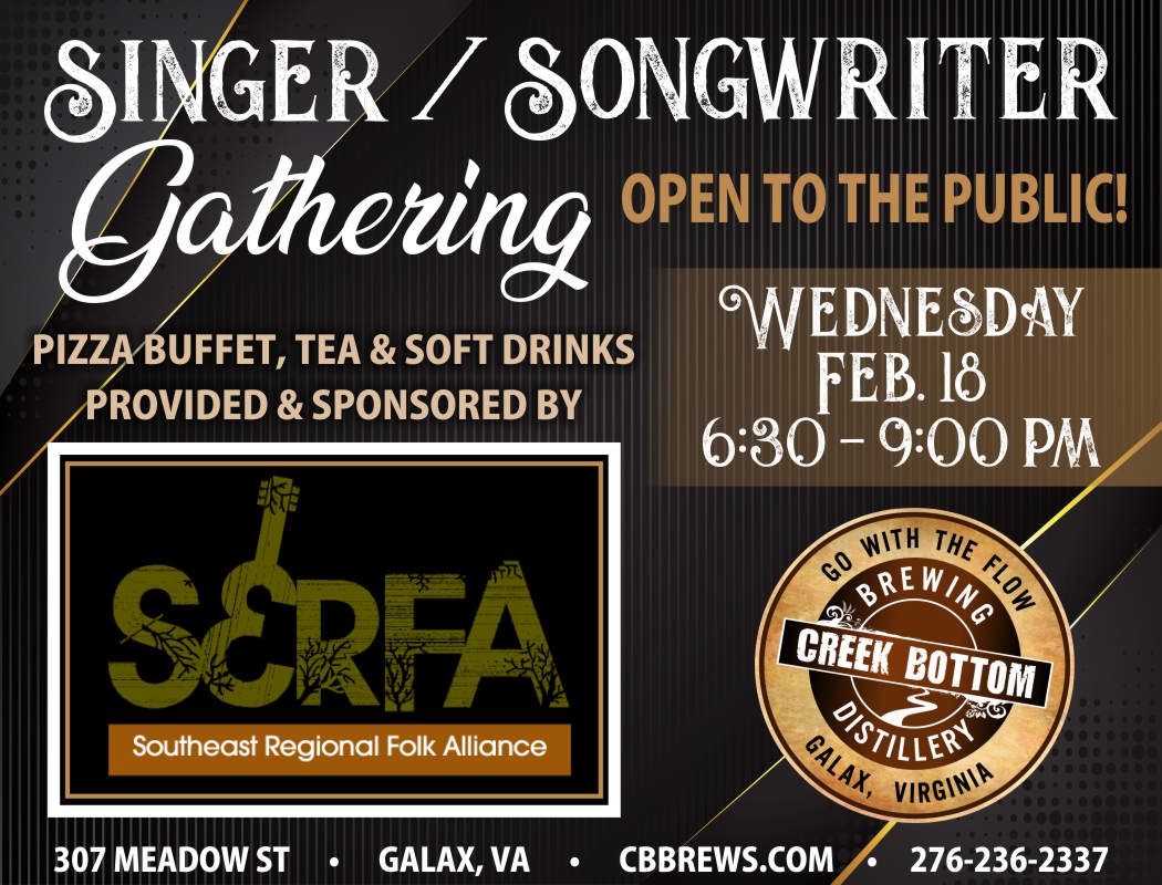 Creek Bottom Brewing will hold a singer/songwriter event sponsored by SERFA (Southeast Region Folk Alliance) on Wed, Feb 18 from 6:30 – 9 pm. Johnny Williams will host the event. It is open to the public. Pizza buffet, tea and soft drinks are provided. Anyone wanting to perform contact Johnny Williams at [email protected]. For more information about SERFA go to www.serfa.org. The 2026 conference will be held May 28 – 31 in Owensboro KY.