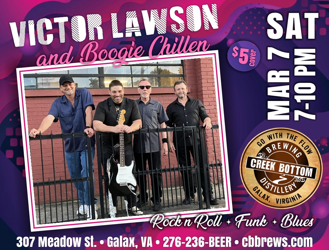 Come on down to Creek Bottom Brewing on Sat, Mar 7 from 7-10 pm for the Victor Lawson and Boogie Chillen show. They have forged an identity as a good-time party band that plays down in the mud rock ‘n roll, funk & the real deal blues tuneage. Eat, drink & chill at The Bottom this weekend! $5 cover.